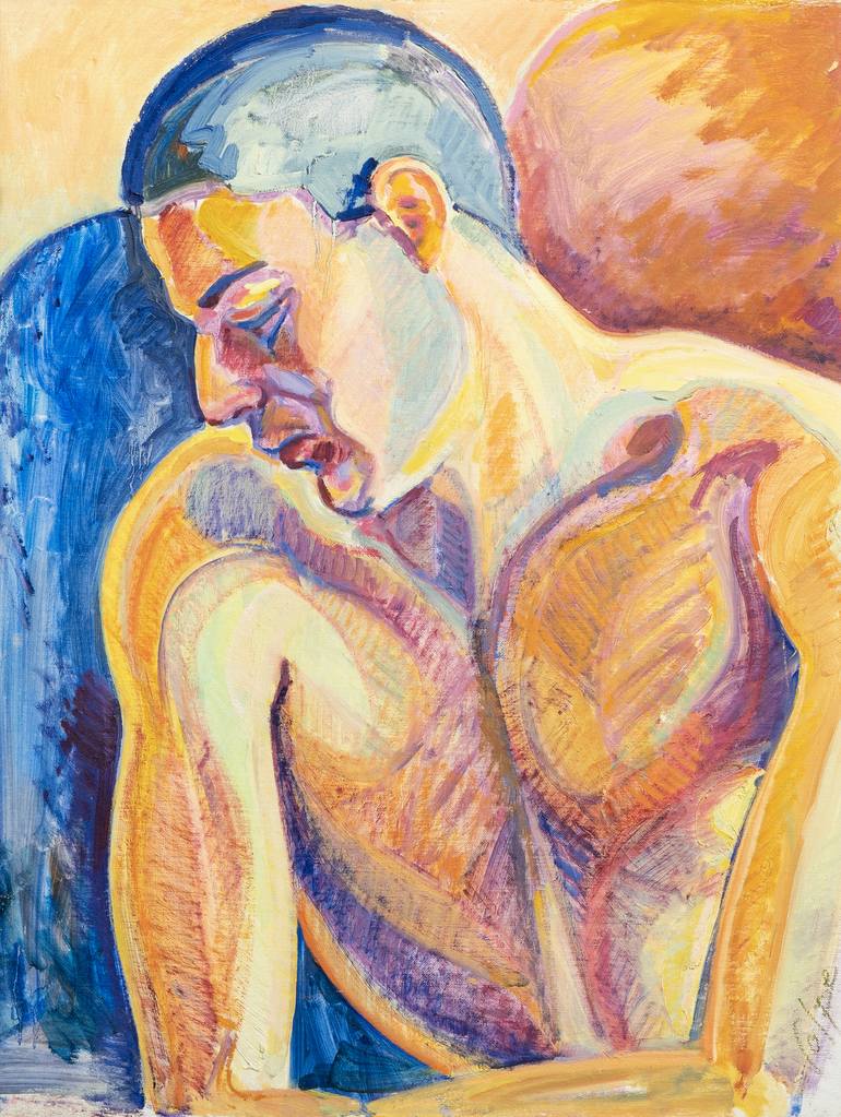 This 2003 painting by Emanuela Volpe is a study of the proportions of the male body after the painter had long experimented with the female form. The subject is represented as an angel in a thoughtful pose, almost absorbed in his thoughts. The two wings, represented by blocks of vibrant and contrast...