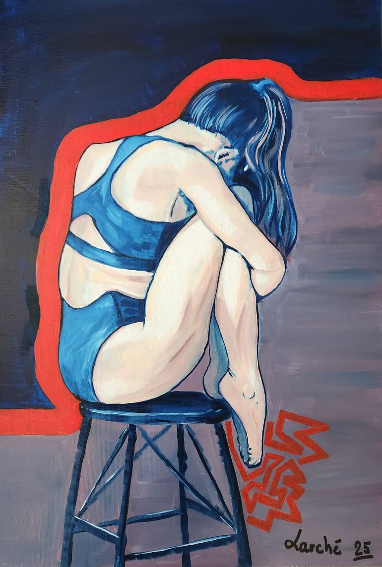 The subject was 'Expression'. Oil on canvas of a woman (probably a dancer), back view. The pose/body is very expressive. Treated in blue and red with stripes to highlight the body.
