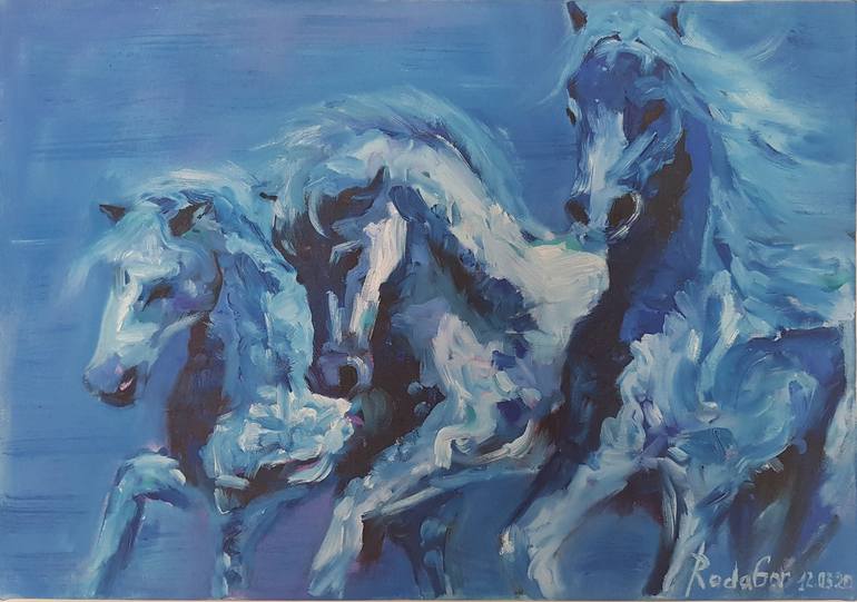 The painting "Horses in the blue fog" Size 19.5*13.65*0.975 inches (50*35* 2cm.) Original oil on cotton canvas. An original painting will decorate your home. It will be a wonderful gift. Author Rad Gor. The painting is written 03/12/2020