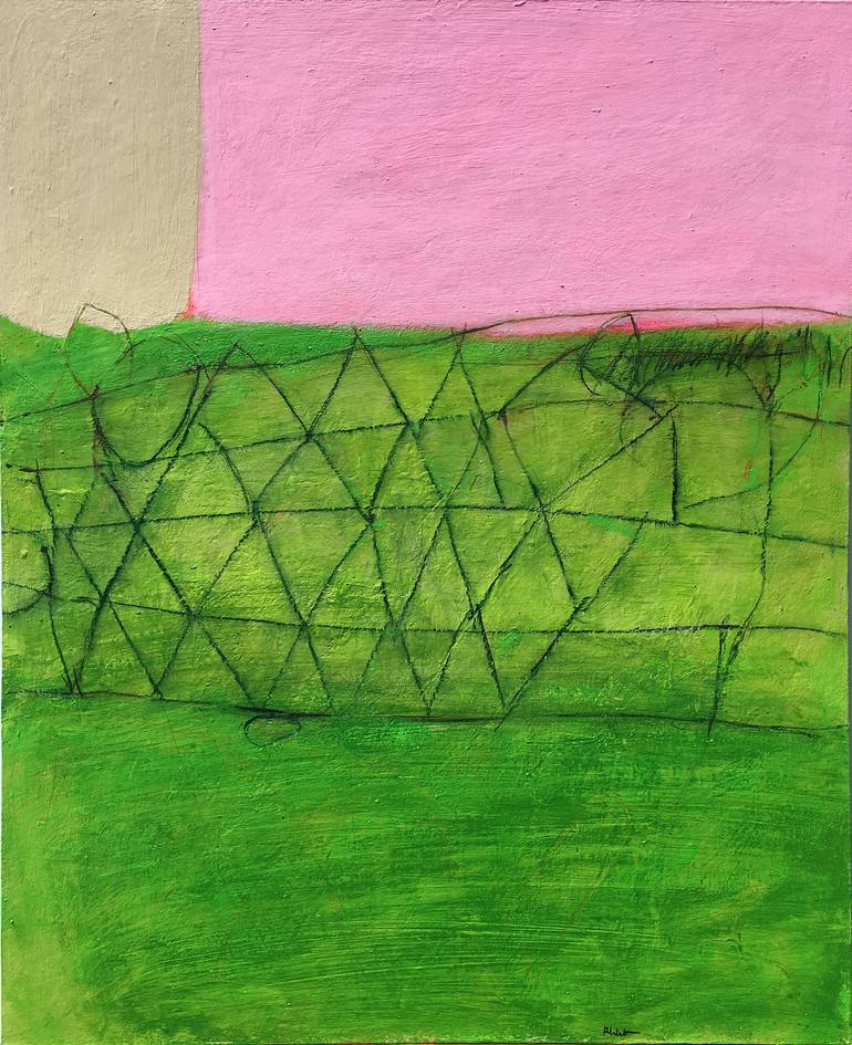 The painting is inspired by nature with the paths inside it and the geometric presence of an anthropized nature. One day, one mounth ago, towards evening I went to run and I found everything so fascinating: the hill that flowed beside, the geometry of the meshes of the safety net (for falling rocks)...