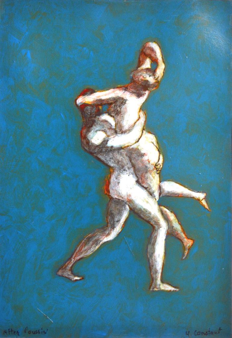 Painting based on a work by Nicolas Poussin French artist. I liked when I saw the Poussin the energy, spirit and sensuality of the work. I chose to use a blue background as a symbol for optimism, movement.