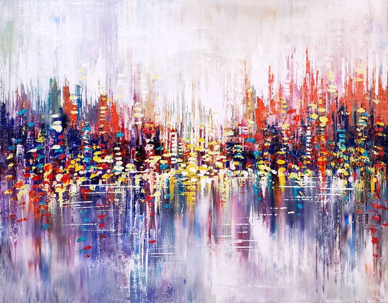 The shoreline glistens like a mosaic, where the sea pours its soul into the land. This is an original palette knife cityscape painting. Size: 22" x 28" Sides of the canvas are painted grey. Protective coat of satin varnish applied. A wire for hanging is attached. The painting is signed on the front...