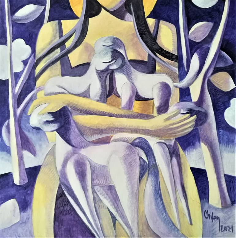 original acrylic on canvas painting 60 x 60 cm The painting depicts a young woman holding in her arms some fantastic characters who are meant to bring peace to the soul in the middle of the night. The painting is made in shades of purple which gives the viewer a melancholy feeling. Packing in 3-4 d...