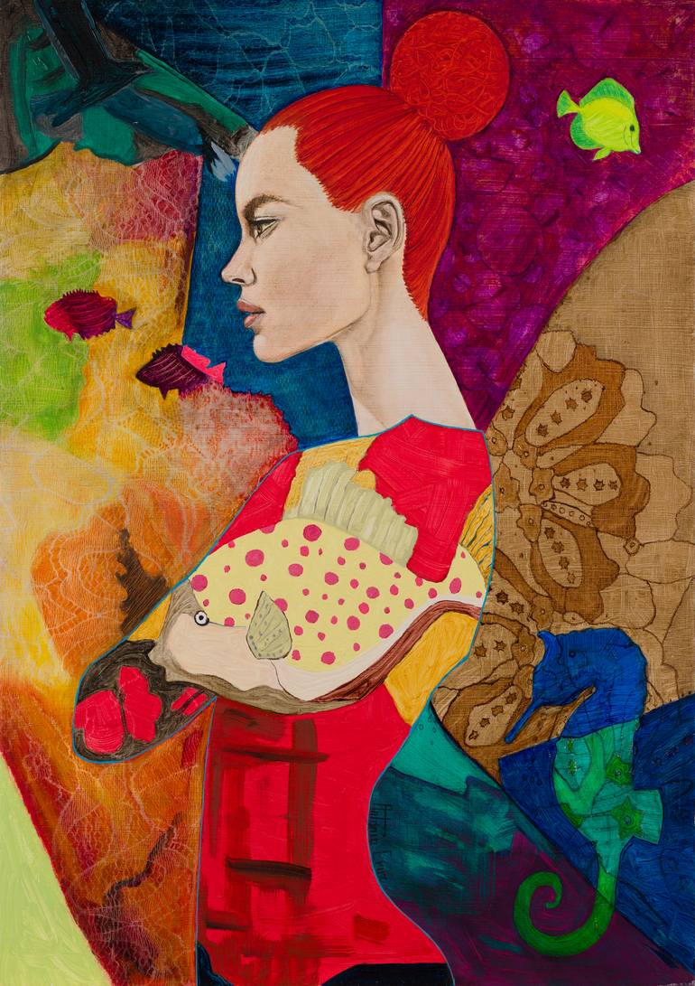 A mesmerizing red-haired woman stands, arms crossed, like a guardian of a forgotten underwater world. Surrounded by vivid sea creatures, she appears almost otherworldly, her gaze serene yet commanding. The collage-style artwork immerses the viewer in a vibrant oceanic dreamscape, where her fiery hai...