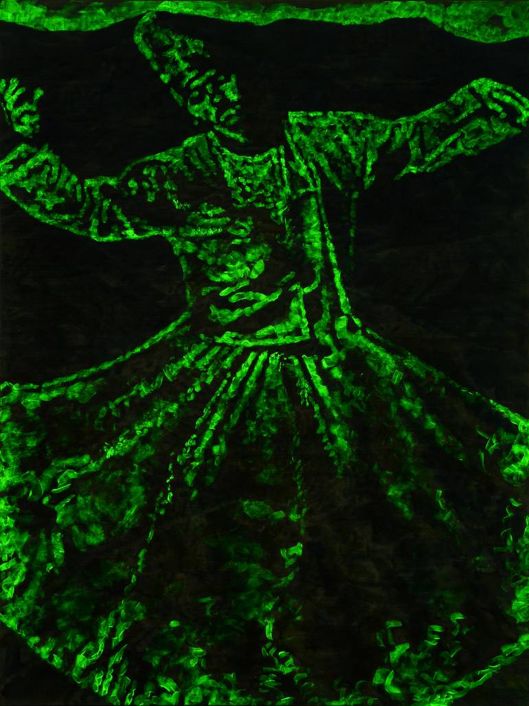 This is a completely unique work of art. In ordinary light, the spectator contemplates a metaphysical landscape. But when you completely turn off the light, then on the canvas appears Sufi Whirling! Sufi whirling is a form of Sama or physically active meditation which originated among Sufis, and whi...