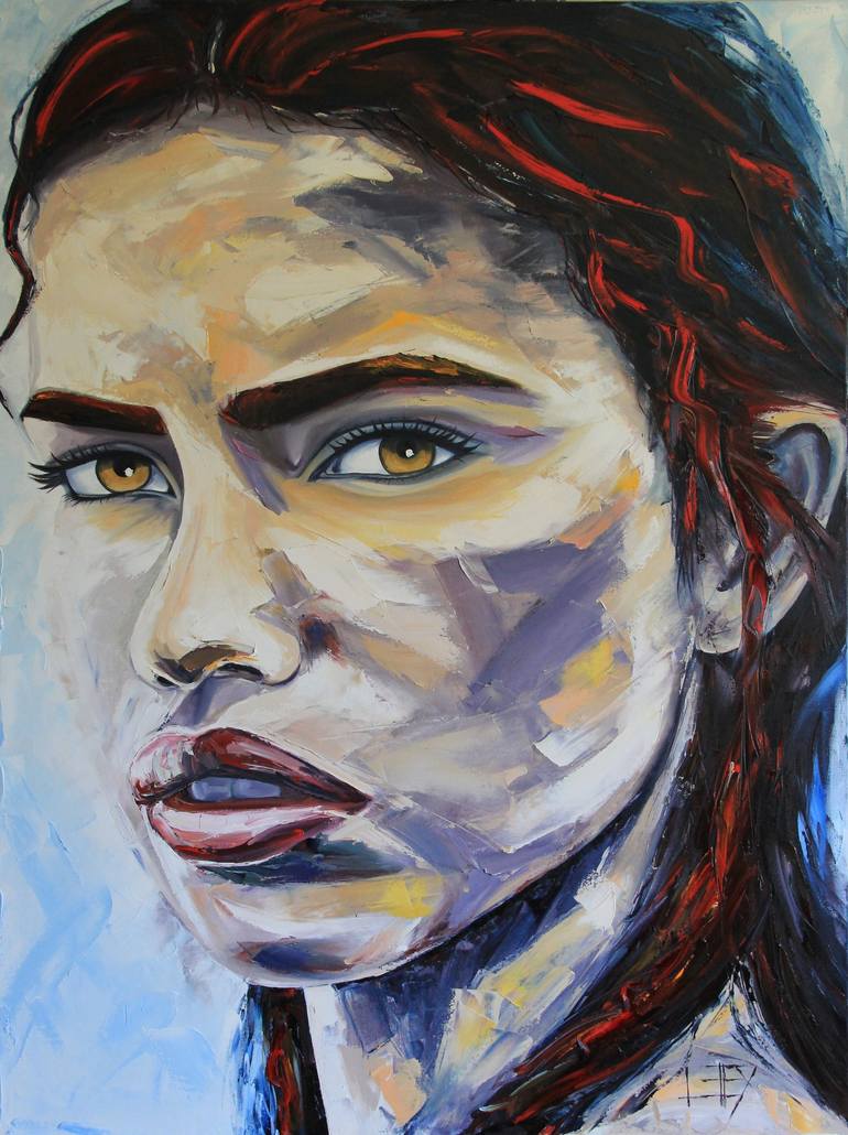 SOLD: A hot night in Brazil by Lisa Elley. Palette knife painting in oil. 36 x 48 x 1.5 inches. 2014. Sides painted, no frame required, deep edge canvas. This painting was a moment in time captured by my knife. What is she thinking? Is she sad? Angry? Frustrated? Sexy? You be the judge!