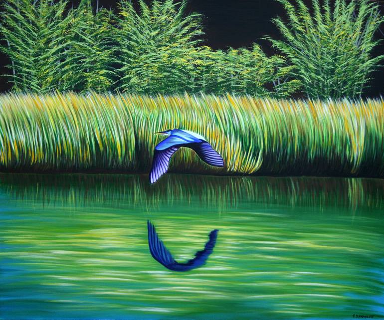 Heron flying over a lake. Acrylic on canvas.