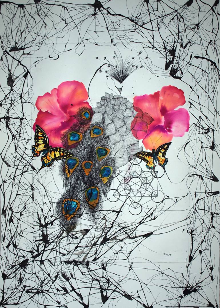 I found a place inside, so tiny, so sacred, I don't have words for it, so I paint it. For me art is a magical method of healing. I try to search for real art, the one that is the highest expression of the spirit. As I create I feel the higher aspects of myself finding their way into the material world, the paper. The geometric shapes that I constantly draw, show the many dimensions of life available . The square represents the physical, the manifest, that which we know. The circle represent the unmanifest, the spirit and space. The triangle symbolises the threefold in nature: manifest, unmanifest and the human being which contains both. When I integrate them I can see life in all the dimensions. The aim of my art is to integrate my self to the point that there's no longer any difference between who I am inside and outside. This art serves as a tool for personal transformation, and I have noticed it aligns and harmonizes spaces where they are displayed. By evoking ancient mexican tribal traditions and rituals, which I have personally experienced, and highly spiritual concepts such as sacred geometry, sacred patterns, the integration of the feminine and masculine, sacred naguals and shamanic figures, I try to become more aware of my own consciousness. Therefore art becomes the highest expression of the spirit.