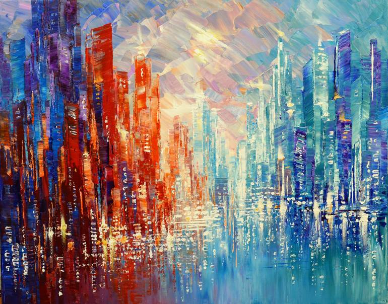 This is an original cityscape painting. Size: 24" x 30" x 1" Sides of the canvas are painted gray and can hung with or without frame. Wire attached. Protective coat of satin varnish applied. The painting is signed on the front and the back and delivered directly from my studio.