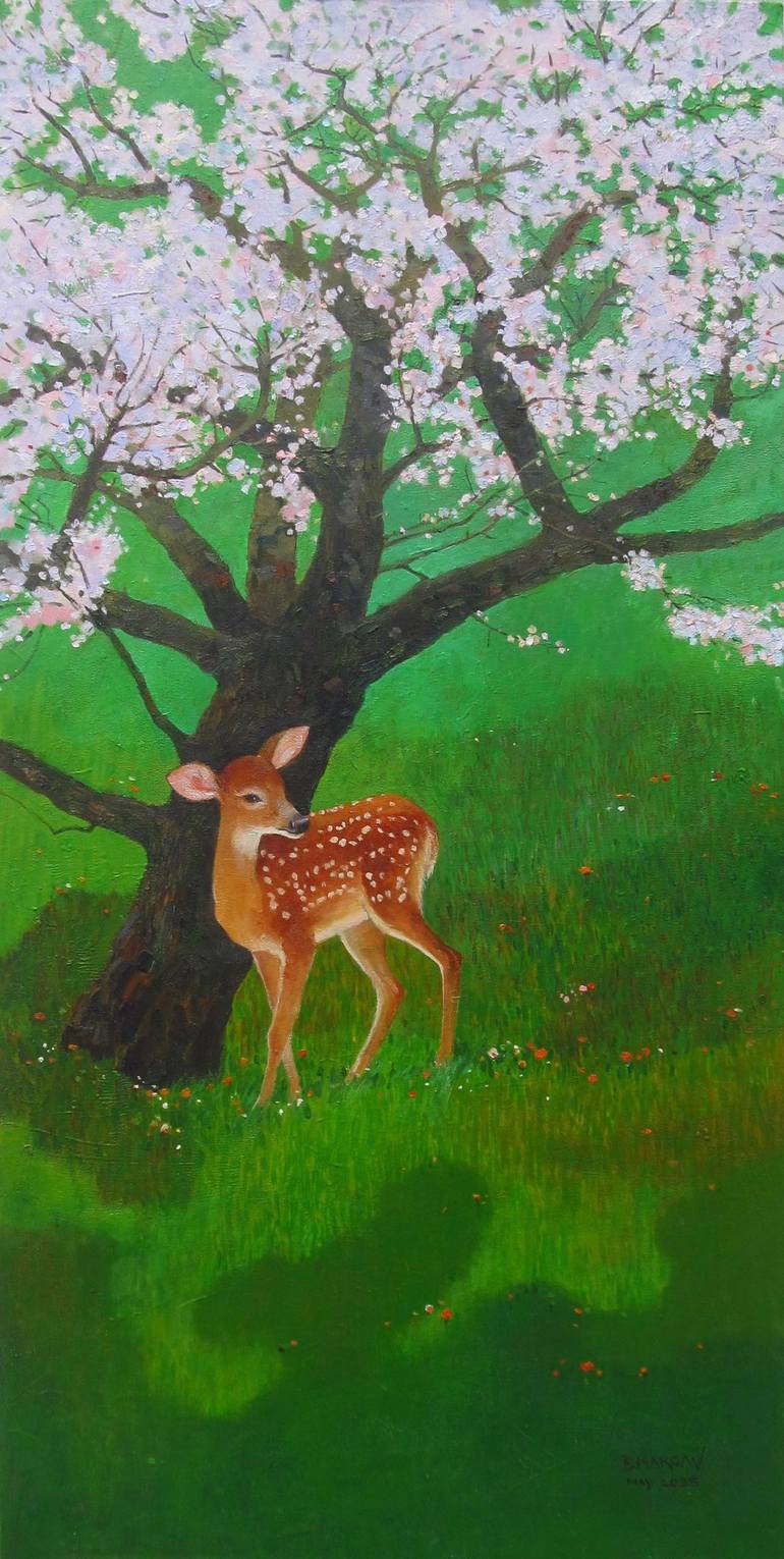 This painting captures a tender moment of innocence beneath a blooming tree, where a young deer stands still amidst nature’s gentle embrace. The vibrant greens and soft blossoms evoke a sense of renewal and peace. The deer, both curious and cautious, symbolizes fragility and harmony in the natural w...