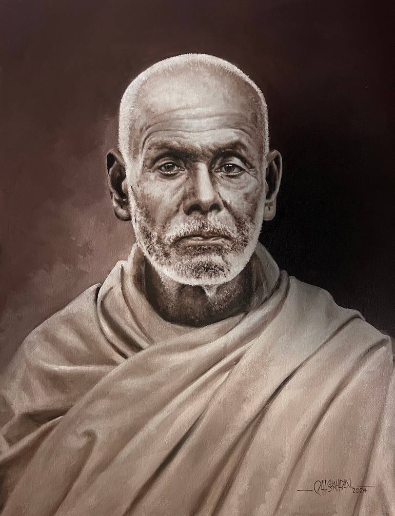 Oil portrait of sree Narayana Guru by Artist Rajasekharan. The artist used vandyke brown as a major color for this portrait
