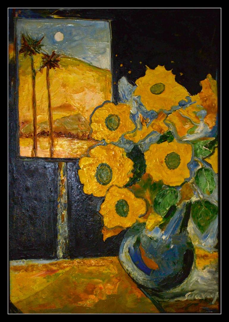 STILL-LIFE-4,ACRYLICS PAINTING THIS IS AN ARTISTIC ARRANGEMENT OF FLOWERS ,LEAVES,AND VASE IN A BEAUTIFUL COMPOSITION.A JOYFUL,CHEERFUL,BANQUET OF VIBRANT COLORFUL HAPPY FLOWERS PAINTED IN A IMPASTO TECHNIQUE, WITH BOLD PALLET KNIFE STROKES,THAT MADE THEM ALMOST SCULPTURAL TEXTURES OF ACRYLIC PAINT ...