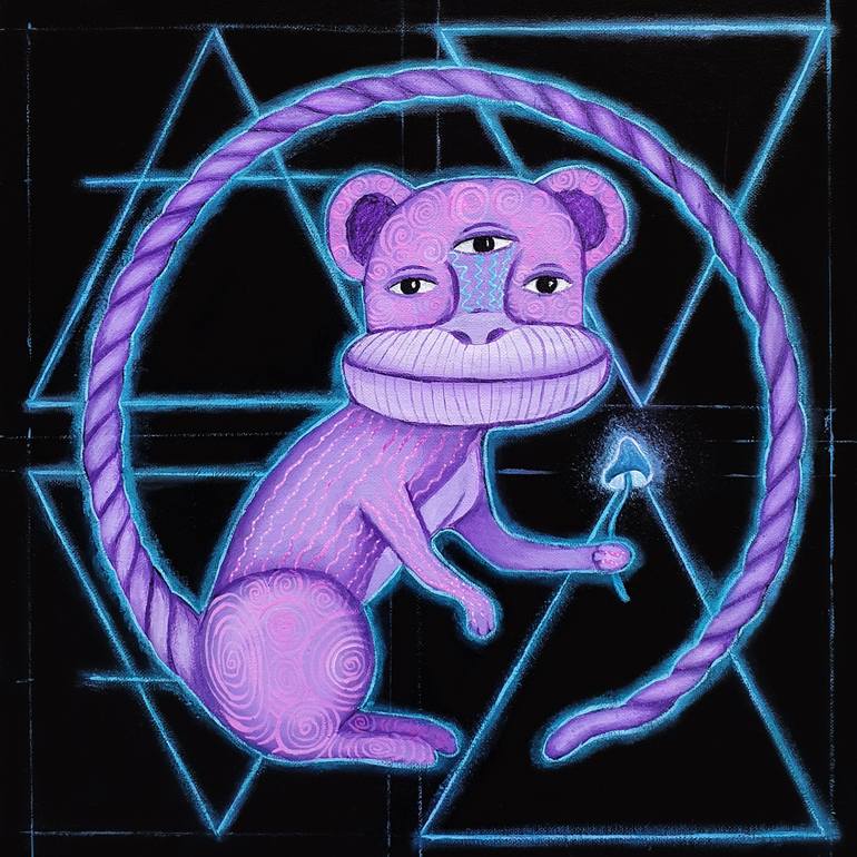 There are 4 elements around the monkey - water, fire, earth, air. The monkey is the fifth element - ether. I was inspired to create this picture by the "Stoned ape" theory of human evolution. According to this theory, homo erectus evolved into homo sapiens due to an encounter with "magic mushrooms...