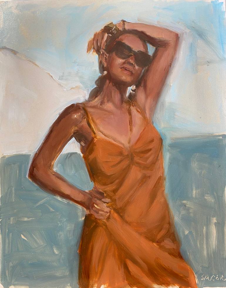 This small figure study combines figurative and abstract styles in warm tones that evoke the heat of the sun and the sense of joy in a solitary moment.