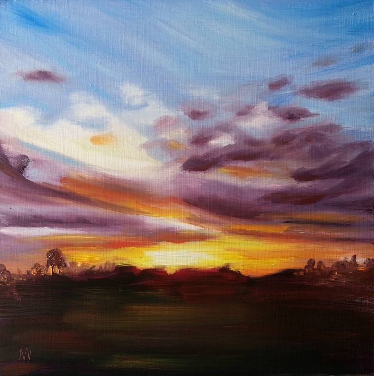 Nice decorative modern picture sunset sky view, gift idea. Painted with oil on gesso MDF panel 25x25x0,3cm. Framed in wooden black frame 26,5x26,5x2cm, ready to hung. Abstract contemporary artwork. Signed on back and front.