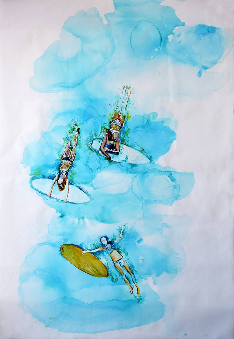 A unique painting using mixed Media, representing girls sunbathing in clear water.