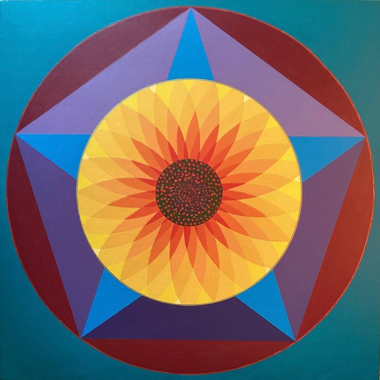 This panting represent a sunflower which has the Fibonacci Ratio (21/34 divisions: 21 divisions clockwise and 34 divisions anticlockwise) with a pentagram and a pentagon all included inside a circle. The pentagram the five-pointed star which it is woven entirely from Golden Ratio or Fibonacci Ratio ...