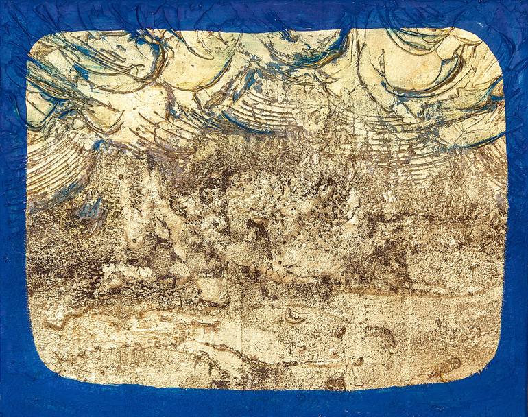 A sunny day at the seaside turned out to be a pretty windy one. Abstract and textured landscape with a lot of gold and light in it. Painted on quality canvas. Sold unframed. Reflective.