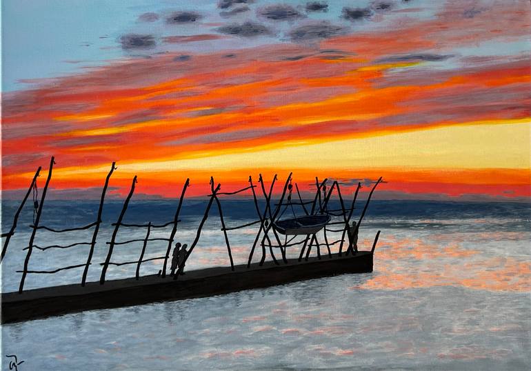 Colourful acrylic painting"Sunset in Savudrija" was inspired by romantic walk along Savudrija bay and enjojing colorful sunset from one of wooden cranes, named grue. Grue are tradictional accacia woden cranes, protected as ethnological heritage of Umag region in Croatia. Walkers on the pier with woo...