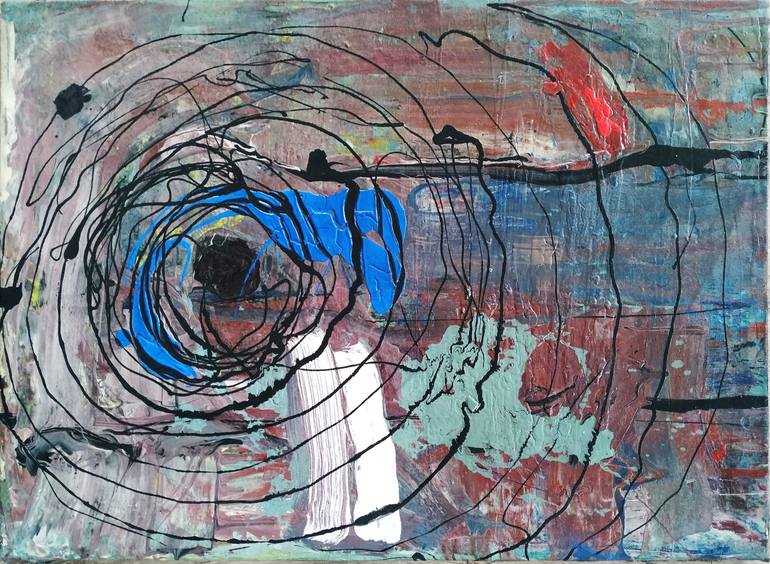 Description of the figurative composition: The canvas depicts the seascape during the sunset. It is structurally divided into two sectors. Іn the foreground we see black circles, which are depicted in the background of the sea sunset. The circles are thin, but they are getting wider closer to the c...
