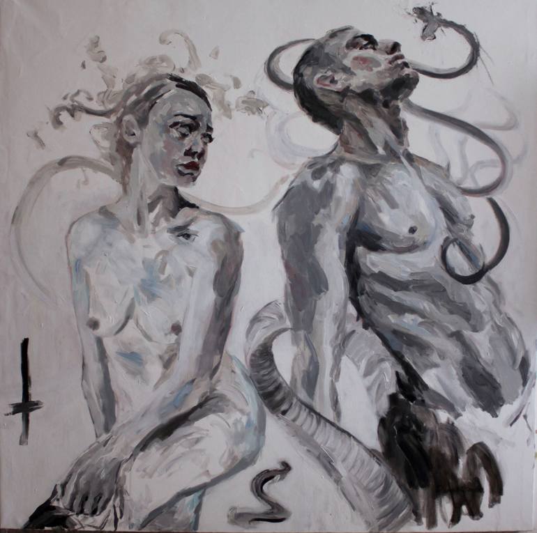 Dark art, figurative, nudity, nude art, people, heavy, black and white, gray, blue, serenity, relaxing art, contemporary figurative, snakes, snake attack, medusa, bodies, composition, acrylic, large canvas, modern, exclusivity, masterpiece, one of a kind.