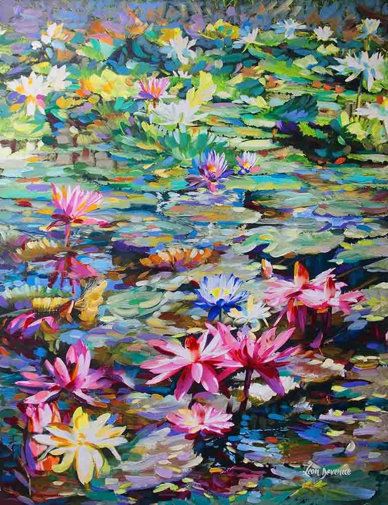 Sacred Lily Pond & Lotus — landscape painting on canvas by Leon Devenice Signature Signed on the front and back Size 40" x 30" Certification COA signed by the artist Medium Hand-painted by Leon Devenice Materials Oil Paint, Canvas Catalog ID ...