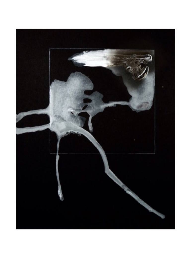 This was a spontaneously produced painting using thinned white acrylic. Allowing the paint to run freely, I wait for the start of some kind of narrative to reveal itself. Once it appears, I go with the idea adding lines and marks. The results are often surprising and more than a little surreal.