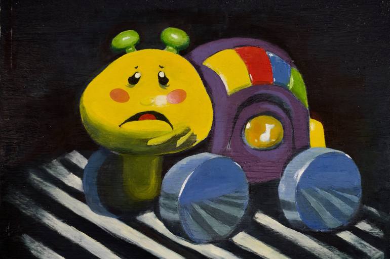 This is a painting from my art school days of a rather sad child's toy. The original toy subject had a smiley face, which I turned into a sad face because it was interesting--and funny-- to see such a bright and cute toy made for fun with such a sad expression. The original is available upon reques...