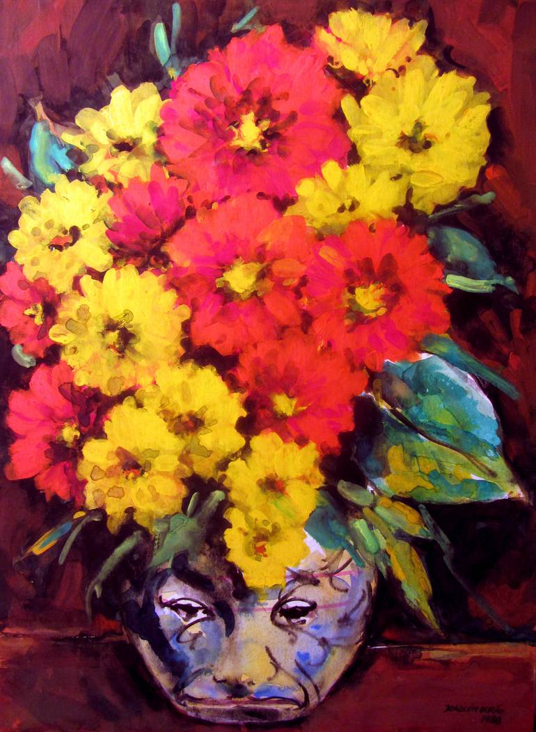 This is a Still LIfe with vibrant color flowers, sitting on a vase where the artist draw a sad face.