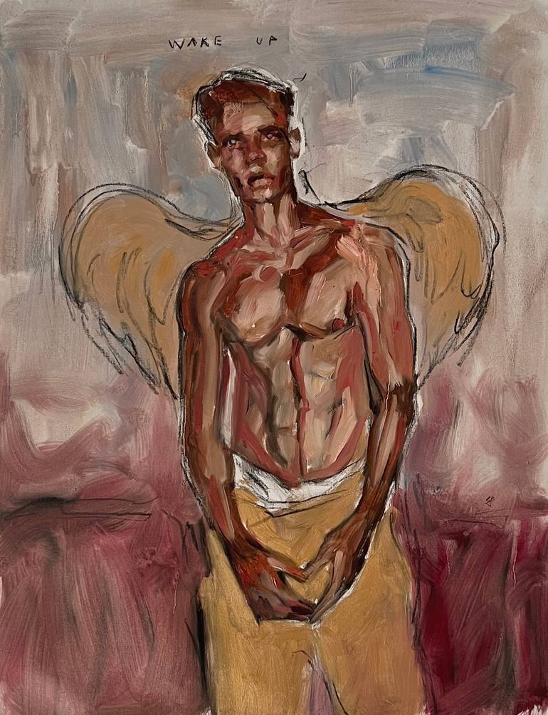 Sad and gorgeous Male angel with golden wings against red whine and blue background. "Wake Up" is the message ..................... Angel figure at the beach, with golden wings and abstract background. ...................... ...