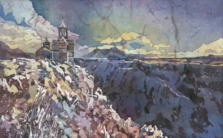 Saghmasovank Monastery landscape painting gorge Armenia architecture watercolor batik painting historical art. Original Painting 12x16" on Japanese rice paper. Mounted on 16x20 Kool-Tack reversible foam core. Unframed. This painting is based on the artist’s original travel photograph (or imagina...