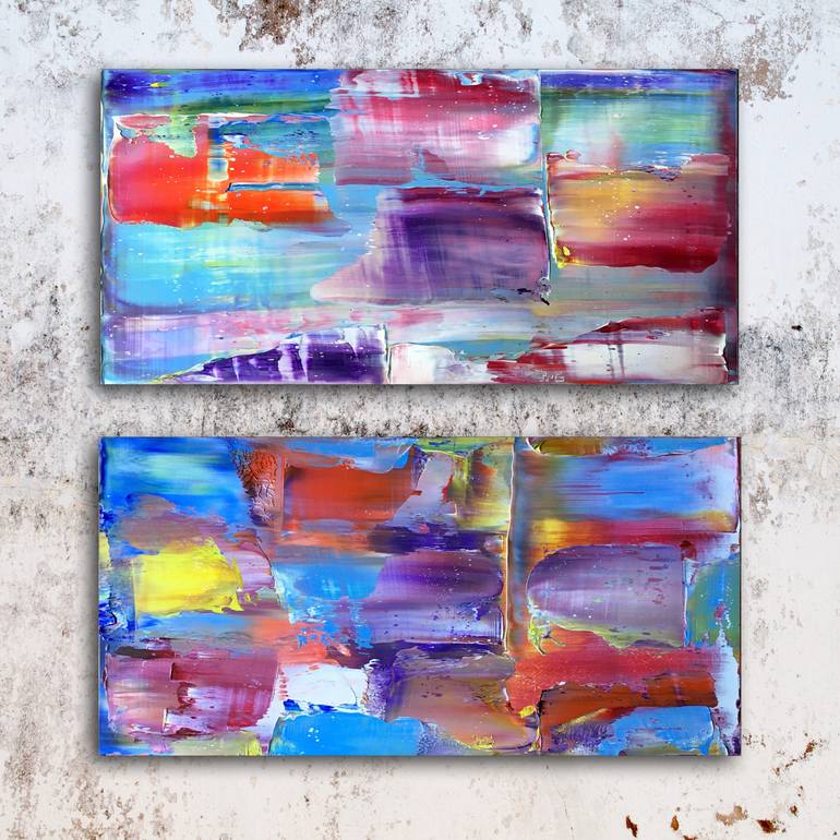 This is a gallery quality diptych, perfect for your home or office. It will bring a peaceful and calming energy to your space. This is a unique and original PMS abstract oil painting diptych. It is part of a series of highly textured, semi-design oriented pieces on recycled wood panels. This diptyc...