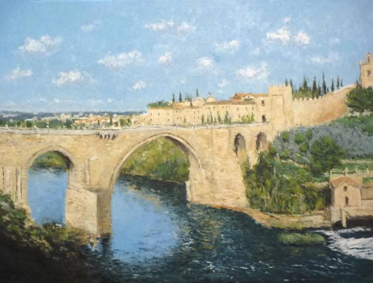 More information about my wortk at: A landscape of the city of Toledo in Spain. It is an oil painting of the Alcántara bridge. One of the most famous medieval bridges that cross the Tagus River and through which the city is accessed