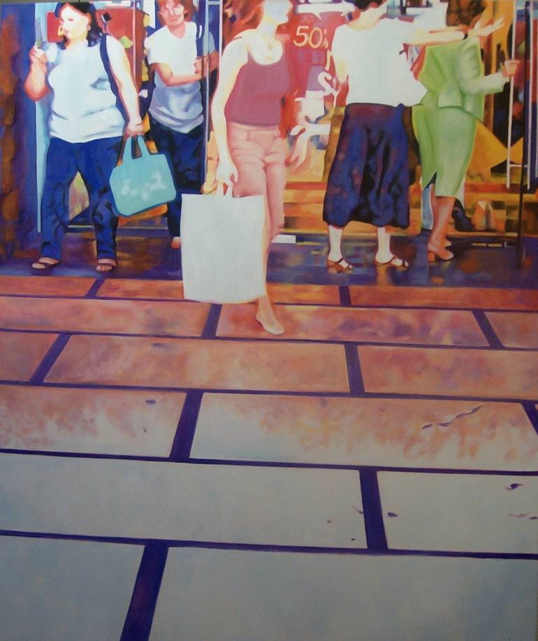 This painting illustrates the moment in which some women come from stores after making purchases.and entering other.. The floor with its rigid geometry contrasts with the movement of people.