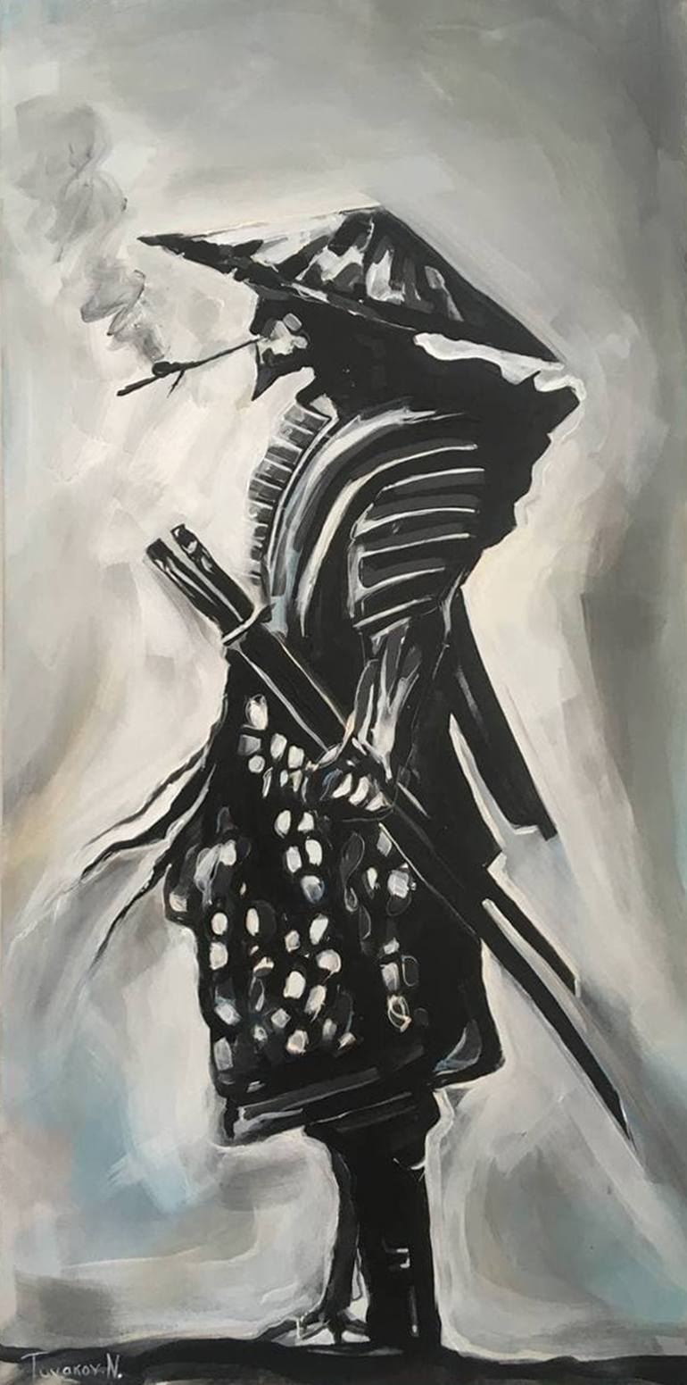 The painting is painted in gray, black and light blue colors. Made with acrylic paints on canvas. The size of the painting: 100cm height and 50cm width.The painting is varnished.