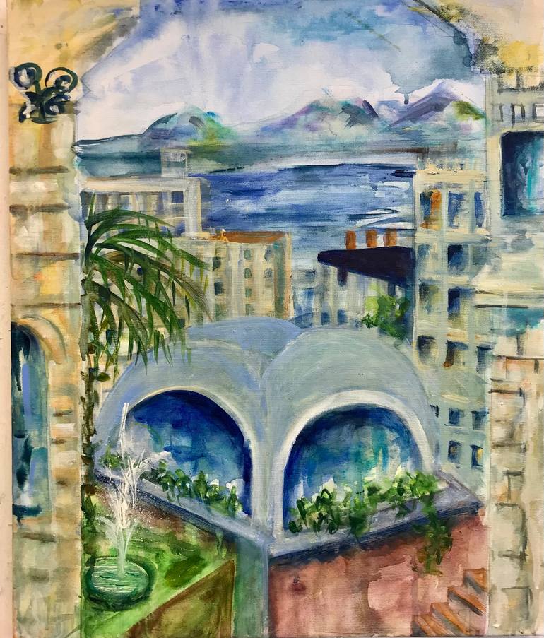 The painting was inspired by a trip to Alaska staying in San Fransisco for a while . The view was very inspirational and I made small studies to work up back in my studio in London. I loved the diverse architecture and the light a pls all oosphere of the city so paired a large version I acrylics.