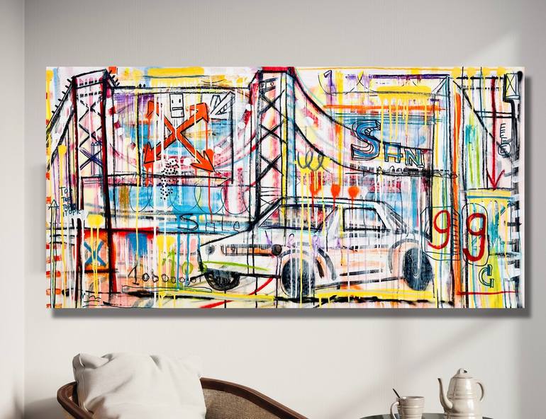 San Francisco, a city that I want to visit, graffiti style landscape. Acrylic and spray on canvas. Unstretched Sent rolled in a tube Signed on the back. Full of color and texture, very happy piece. Thanks for looking! If you like to commission a piece, please do not hesitate to contact me.