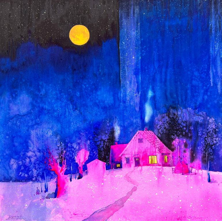 This painting tells a story of solace—a refuge from the cold, indifferent world. The snow-covered landscape surrounding the house stretches into infinity, embodying both the beauty and the isolation of existence, a realm filled with quiet challenges and solitude. Yet, in the midst of this frozen va...