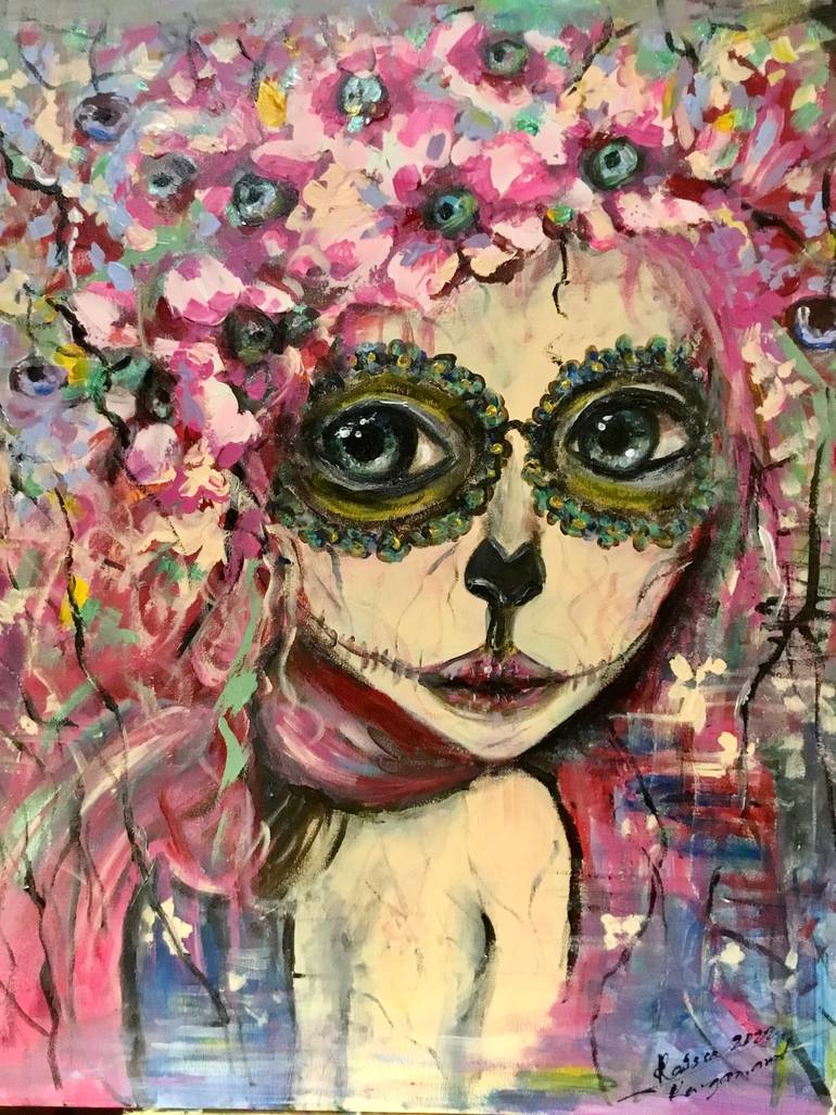 Santa Muerte original acrylic painting on stretched canvas textured floral painting