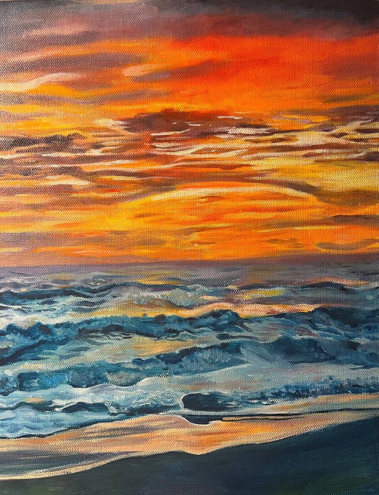 "Santa Teresa Sunset" (2023) is an original painting made in oil on canvas board. It is the first painting I created for my Costa Rica series, depicting a fiery sky, one of the most beautiful sunsets I have ever witnessed in Santa Teresa, Costa Rica. It is inspired by an important and personally tou...