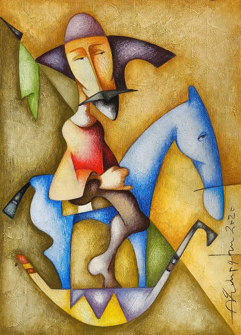 OIL/CANVAS Size - 25x35cm READY TO HANG Original painting, 100% hand painted on canvas. Come with signed certificate of authenticity. This whimsical and vibrant painting features a stylized figure of a rider on horseback, rendered in a geometric, cubist-inspired style. The muted yet colorful palet...