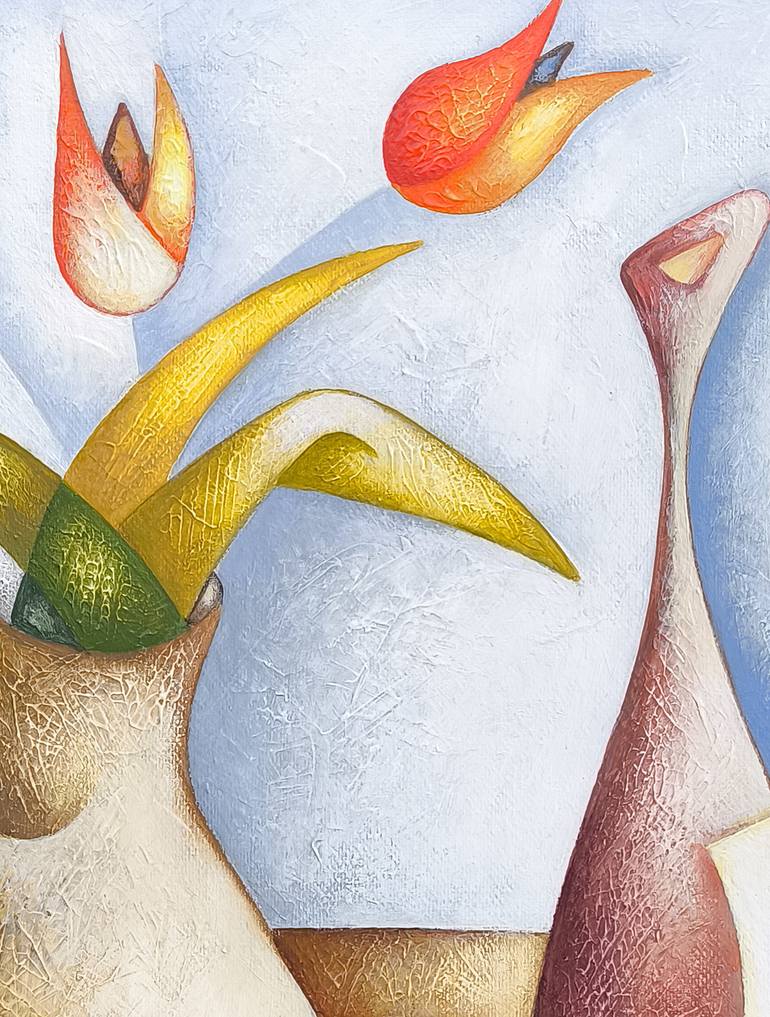 OIL/CANVAS Size - 40x40cm READY TO HANG Original painting, 100% hand painted on canvas. Come with signed certificate of authenticity This elegant 40x40cm oil on canvas captures a modern still life with a sense of quiet sophistication. Featuring a minimalist composition of three tulips gracefully a...
