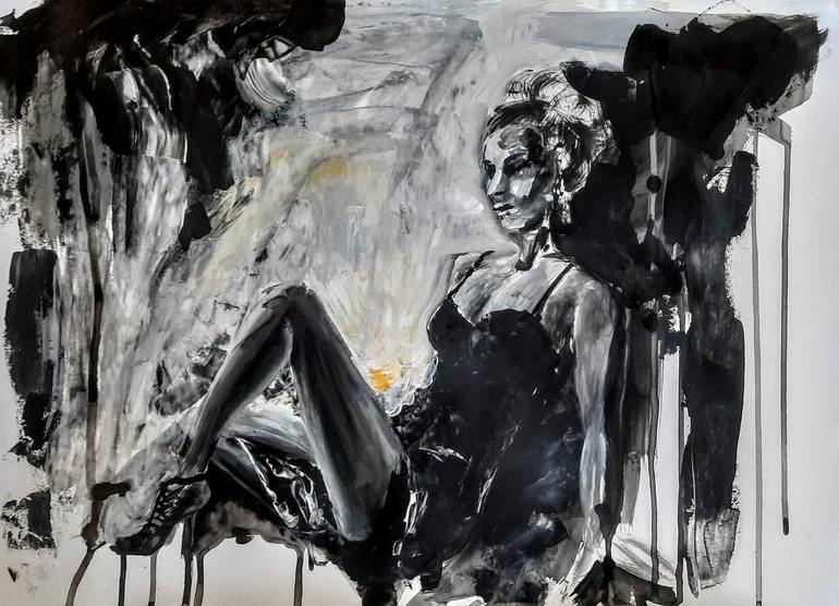 This acrylic on paper painting was created as part of a series the artist created during the 2020 quarantine. It portrays a woman who made the effort- perhaps to go out and socialize, but finds herself to be imprisoned, unable to leave her current state.