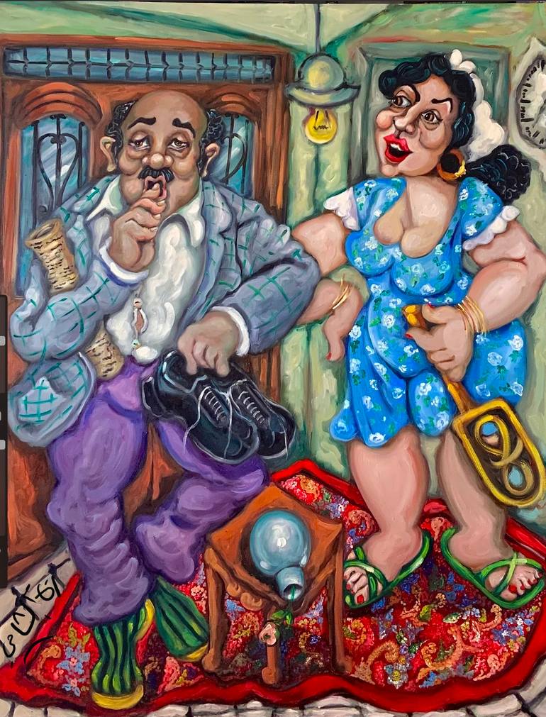 Sarcastic Egyptian folklore, oil painting, storytelling : the painting describes a husband who stays out late and strict wife who sets the household rules . If the husband breaks these rules ,the wife punishes him by beating him. This type of artwork may be inspired by satire or social community on ...