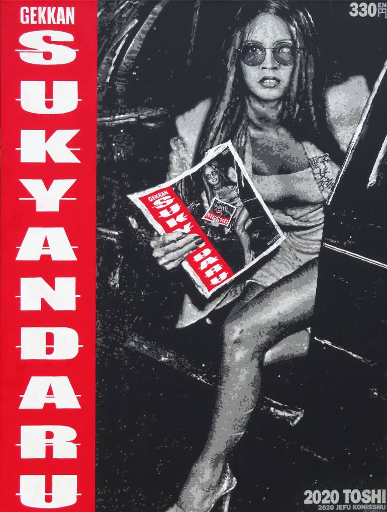 This is an acrylic on canvas painting and the subject matter is a take-off on the scandal rags or tabloids of old and new. Mostly monochromaticcolors with modulated greys, but rich red for the typographic elements. Gallery wrap, and wired in back for hanging. There's some pointillism used in the ...
