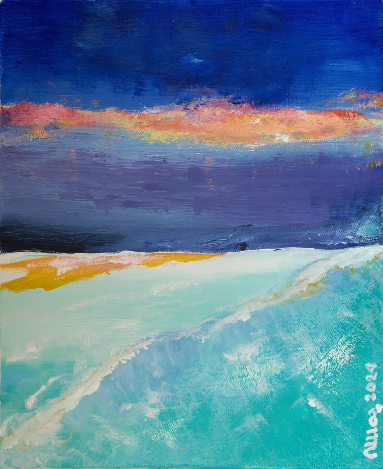 My Scandinavian sunrise painting is inspired by my Nordic background, and my nostalgia. I would call it a dreamscape. I grew up in the northernmost part of Jutland, Denmark. As ever, this work is seen through my mind’s eye rather than stark reality. The almost opaque turquoise hues of the beach and ...