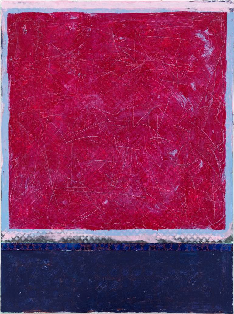 What interests me is the process of layering materials to achieve a rich texture and depth on the surface of the canvas. From a distance, you'll see the design, the shapes and the bold reds and blues of this painting. As you move closer to its surface, you'll see layers showing through one another a...