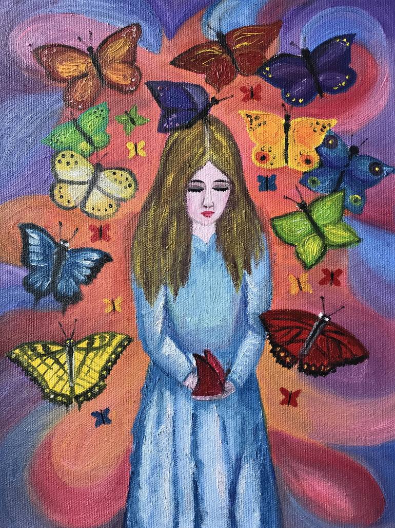 The idea to paint this picture came to me at night when I could not sleep for a long time. I wanted to write something bright, colorful, unusual, unreal. The painting depicts a girl who saw huge butterflies that flew up to her, sat on her head , on her hands. This is a special fascinating atmosphere...