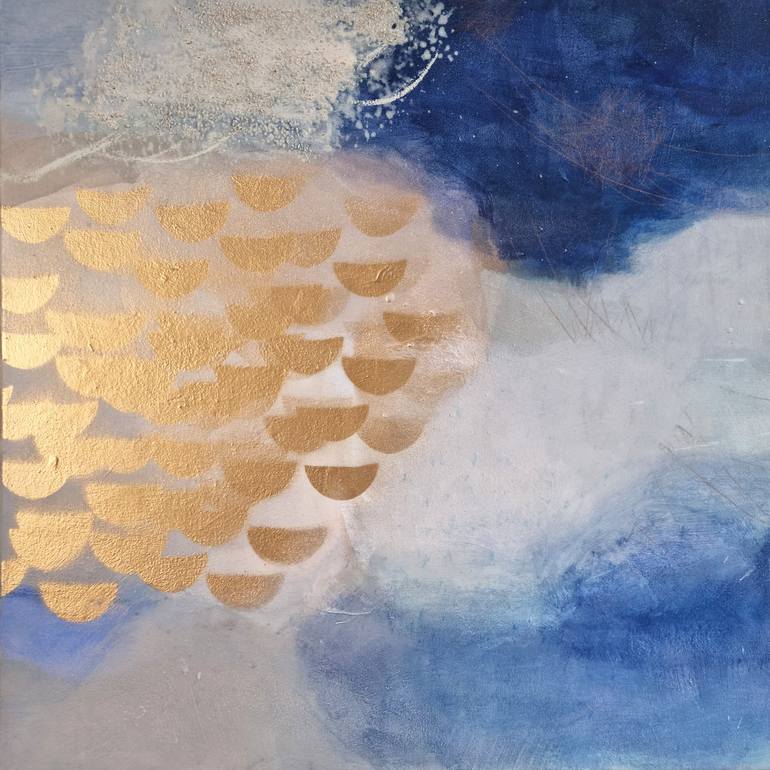 "Floating Dreams" is an original painting on canvas. It can be hung directly on the wall or framed as you like. The picture shows an abstract landscape reminiscent of a sky over the sea. The clouds are painted in different shades of blue, from soft to dark blue, contrasting with the golden area. Th...