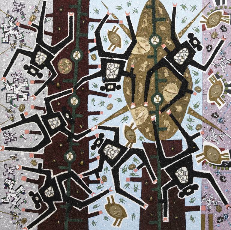 This artwork is a celebration of the archaic and the tribal, the same natural materials used serve to reinforce this dimension. The pop signs that refer to the archaic in a tribal dance where monkeys, representing the archaic form of man, are the protagonists. The work reminds us that we descend fro...